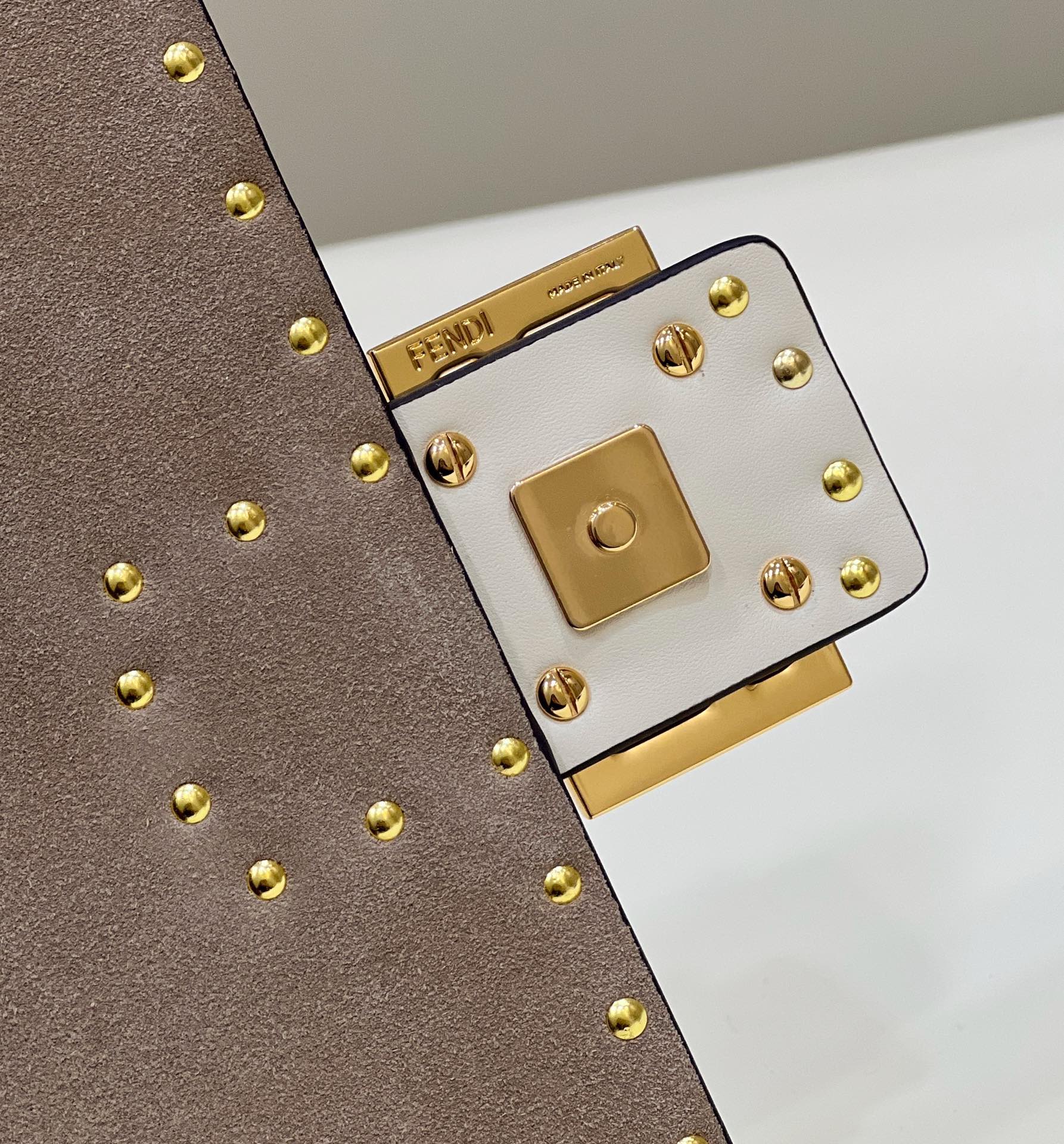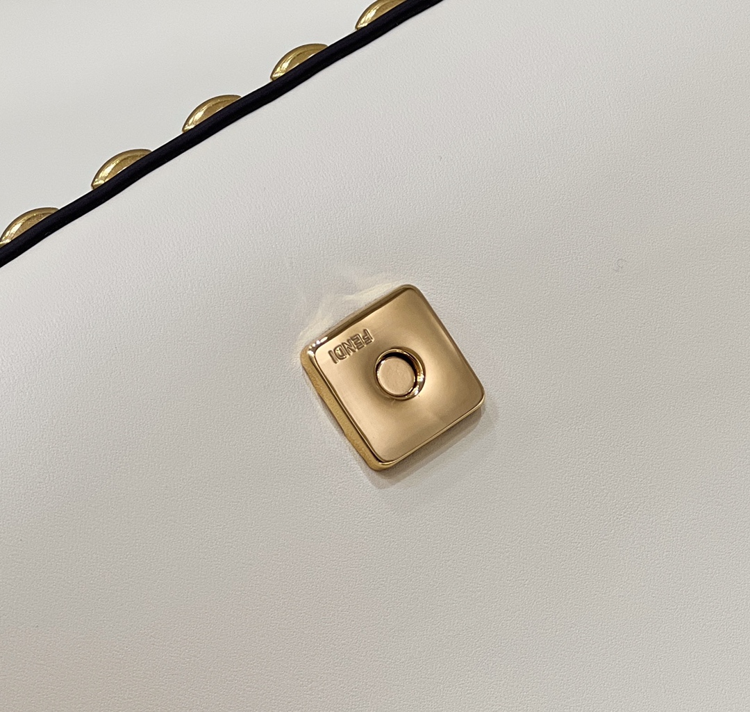 Iconic medium Baguette bag in parchment-coloured leather with Metal Stitch stitching. Decorated with an FF clasp. Featuring a front flap, magnetic clasp, internal compartment with zip pocket and gold-finish metalware. The bag can be carried by hand, or worn either on the shoulder or cross-body thanks to the handle and shoulder strap, both detachable