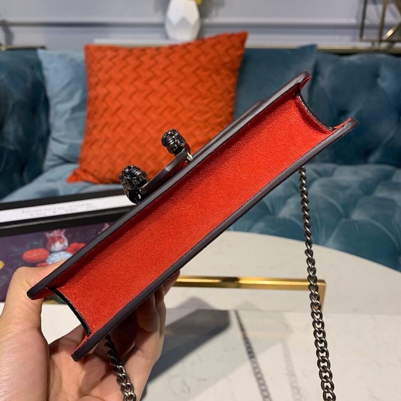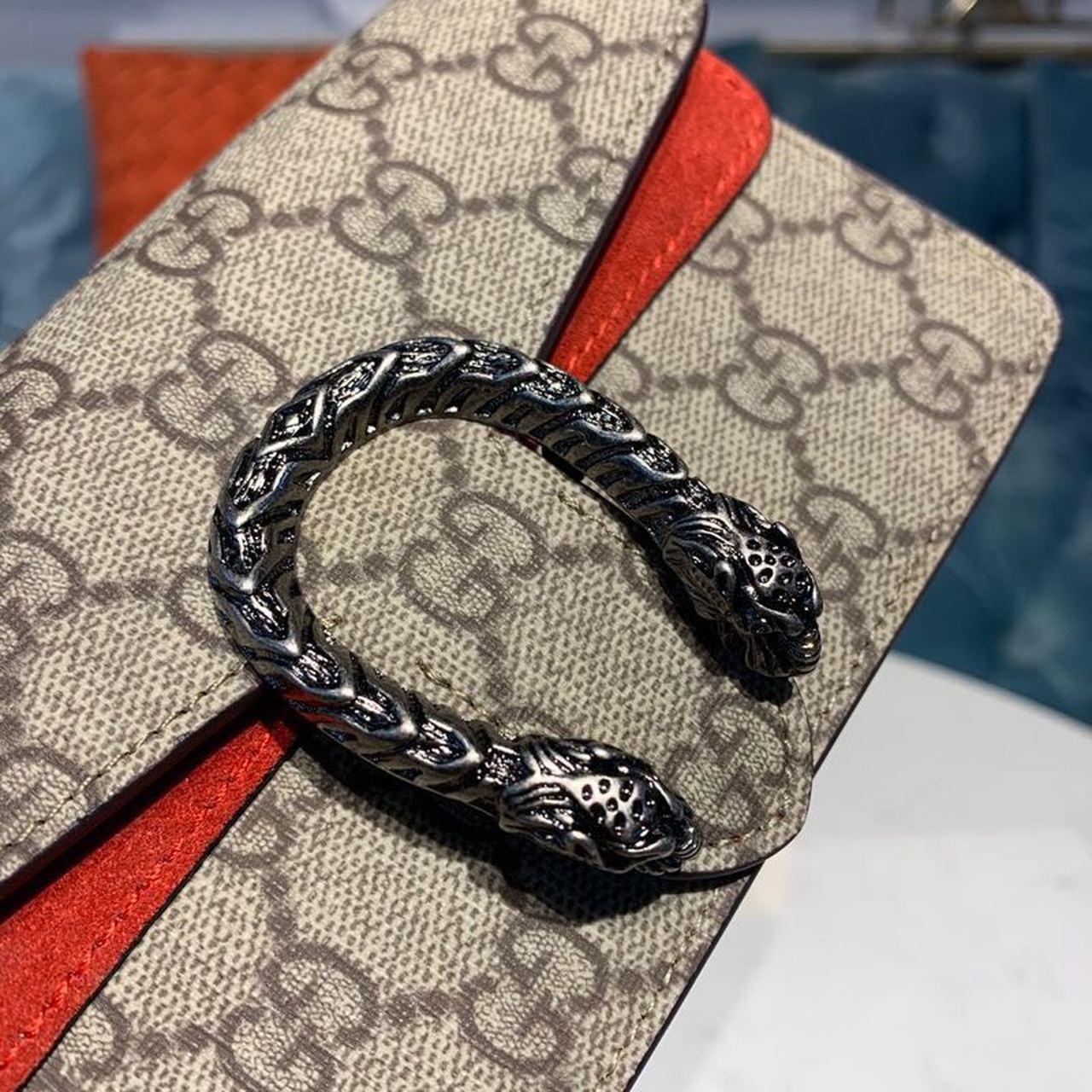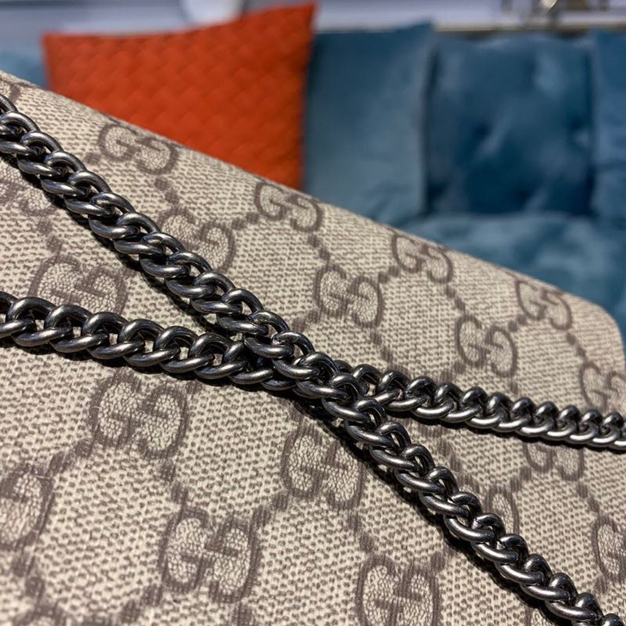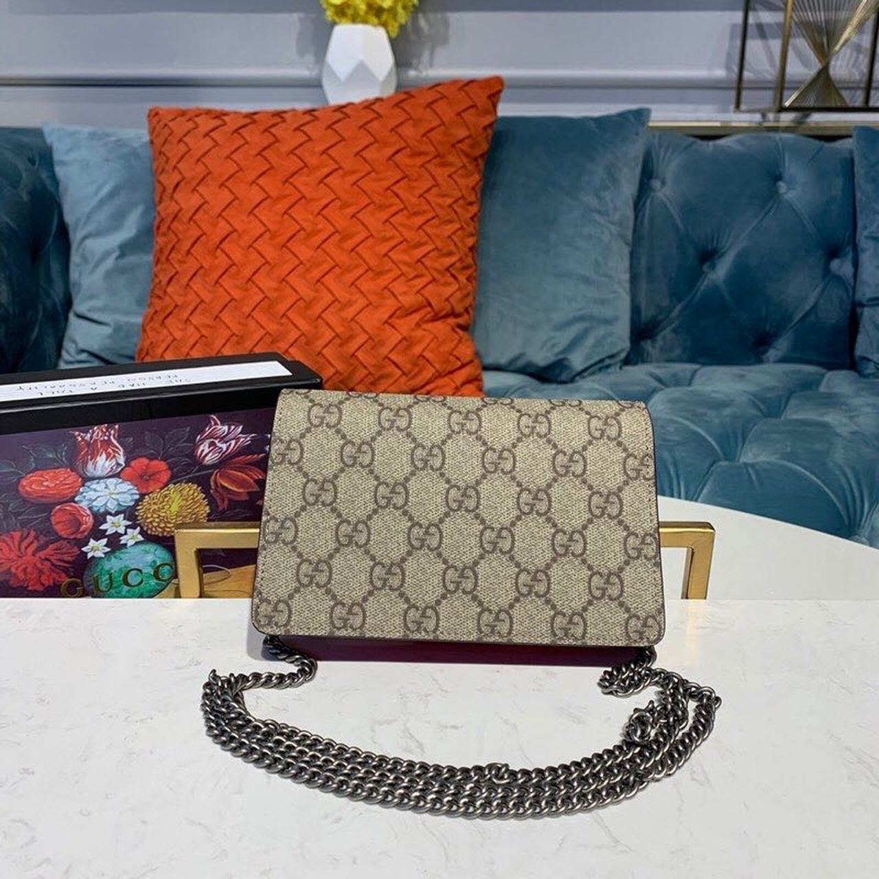 A structured GG Supreme canvas chain super mini shoulder bag with a key ring that can be used to attach this bag to a separate larger bag. The closure has the textured tiger head spur closure-a unique detail referencing the Greek god Dionysus, who in myth is said to have crossed the river Tigris on a tiger sent to him by Zeus. The accessory can also be worn as a crossbody bag.