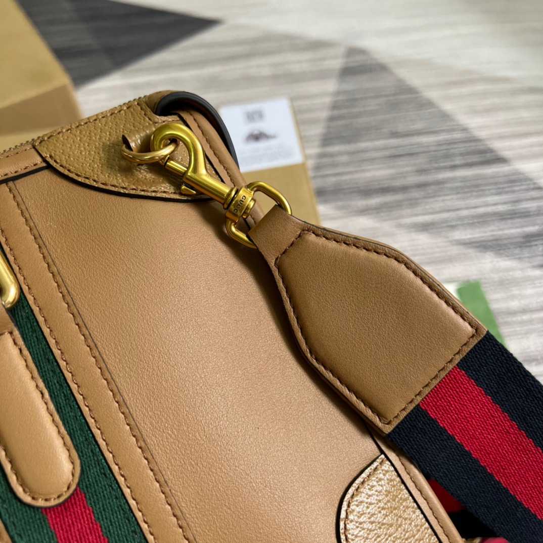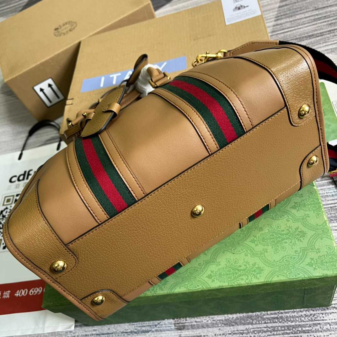 Gucci's handbag crafted in white smooth with blue and red Web stripe. It features gold-tone hardware, zip closure with side lock, double handle and adjustable / removable green and red Web strap. Natural canvas-lined interior with two zip pockets. The design is completed by protective metal feet, the iconic Double G detail on front, a detachable ID tag and keys for lock with case.