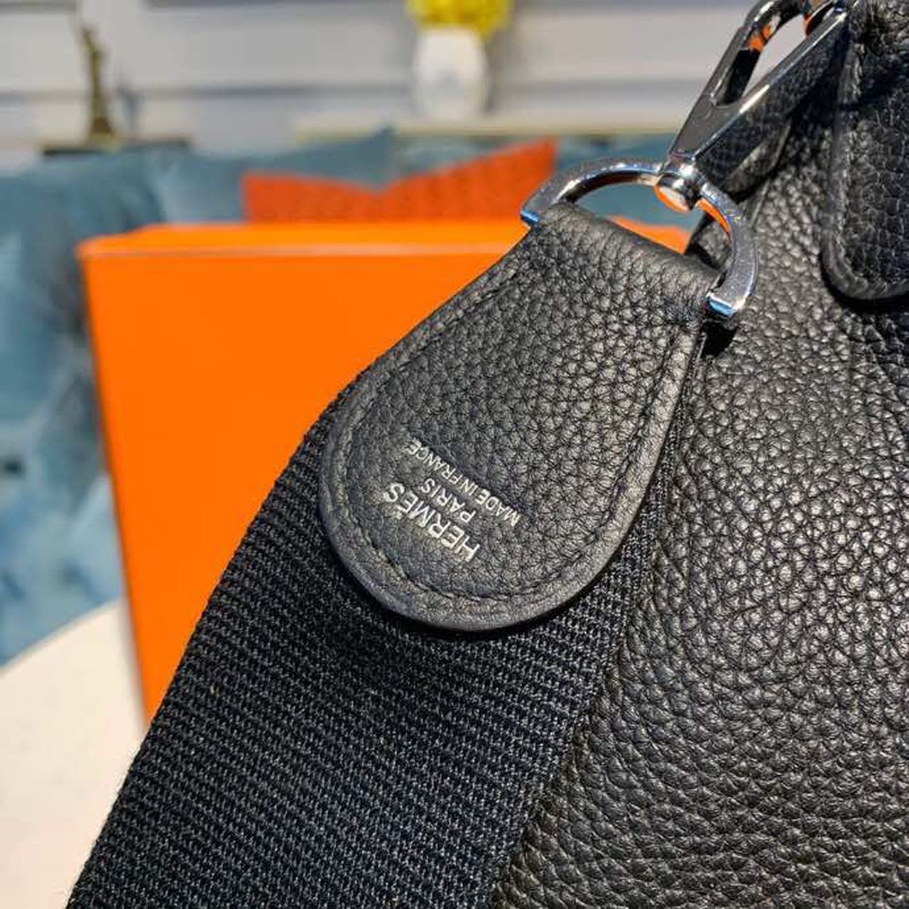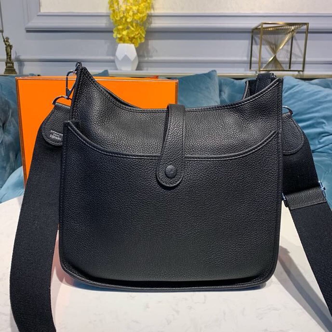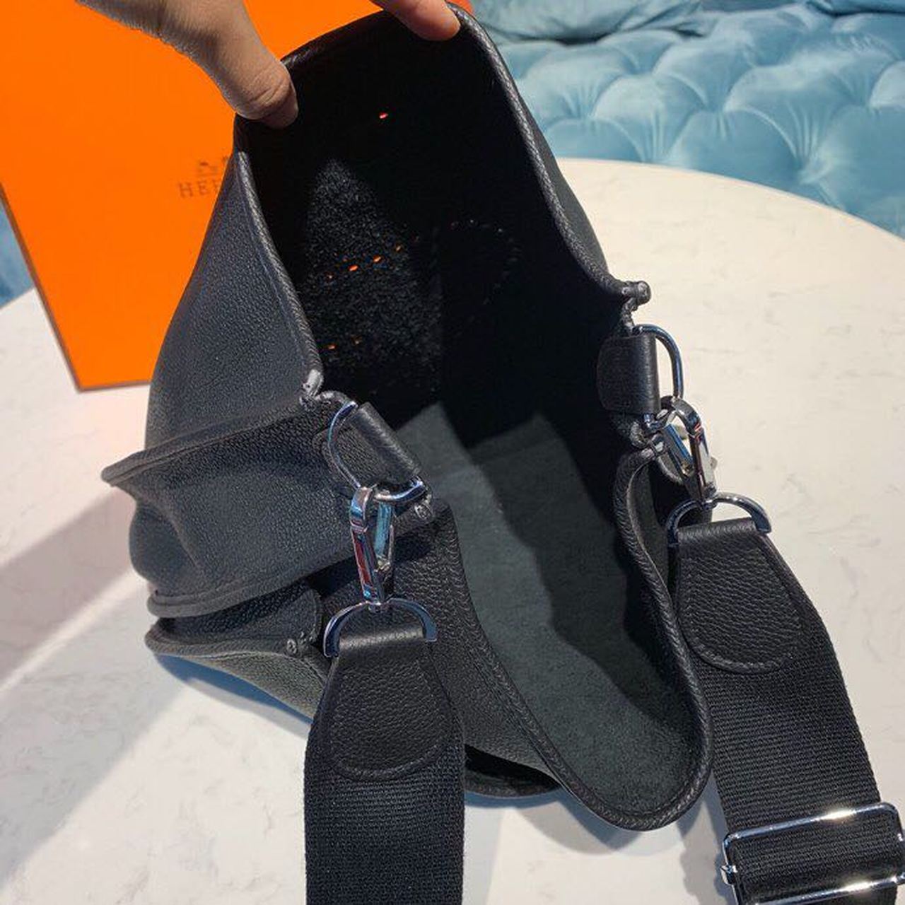 Since 1978, this bag has enchanted daily riders. First intended to tend horses, it is sewn without a lining and brightened up with an “H” perforation, which the initiates wear against the body, in order to allow the equipment to dry. With its girth-like shoulder strap, the Évelyne is the perfect heart-minder.