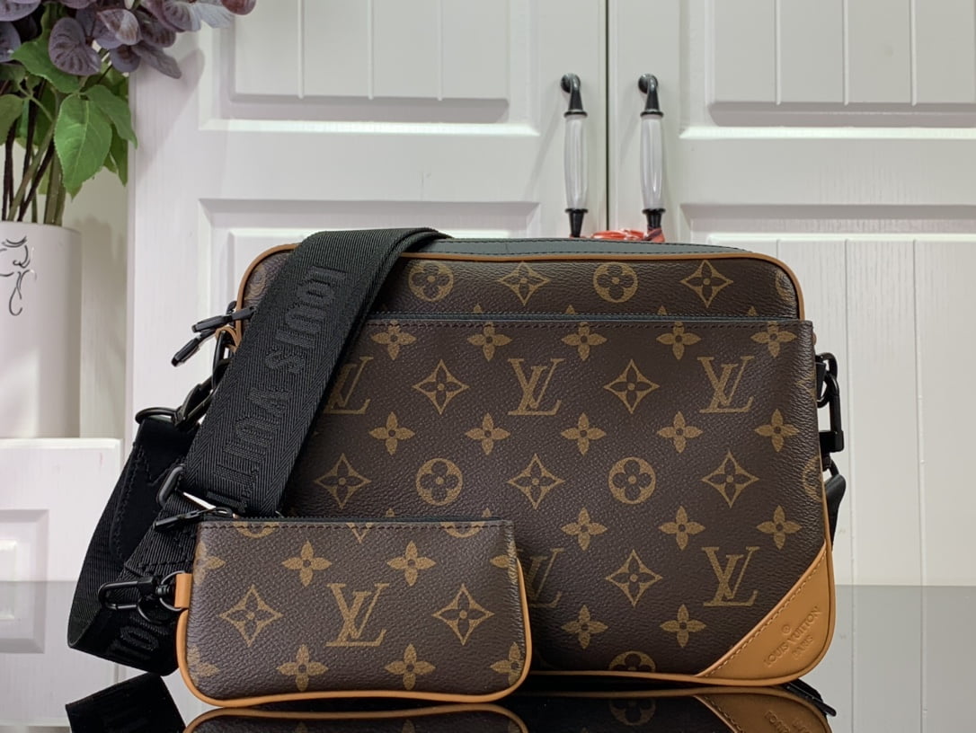 Fashioned from Monogram Macassar canvas, the Trio Messenger bag’s simple but sophisticated lines are highlighted by touches of saffron orange. Three accessories in one, the Trio is composed of a main pouch, a removable front pocket and a coin purse attached to the strap. The black-colour hardware and the black textile strap give it gravitas.